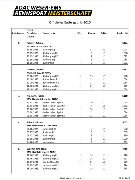 Im Slalom Youngster Cup in der Wertung der Weser-Ems Teilnehmer ist Adrian Rziczny nun uneinholbar und somit Gaumeister der Saison 2021! Somit hat er sich für die Deutsche Meisterschaft des ADAC qualifiziert!